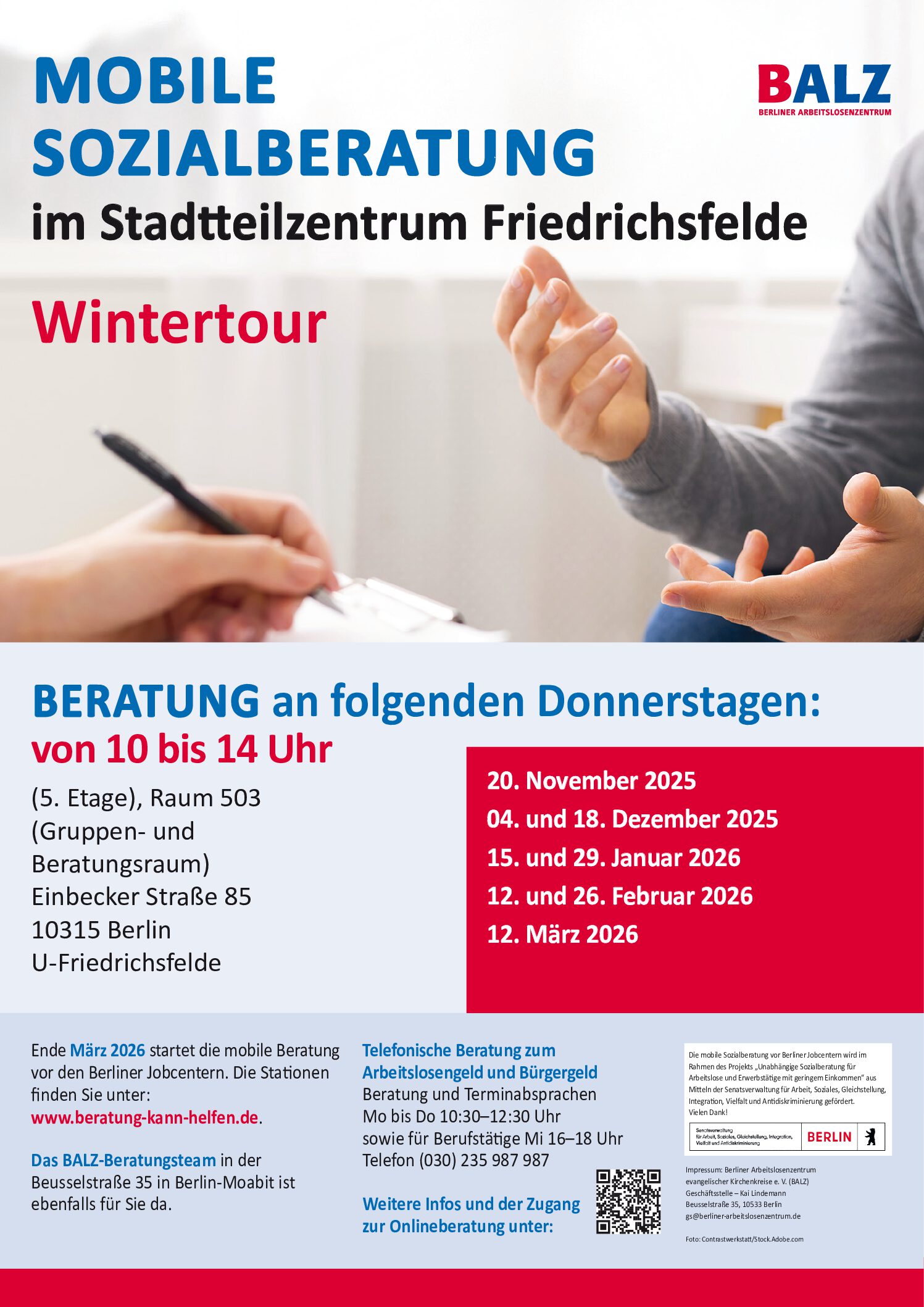 Stadtteilzentrum Friedrichsfelde Einbecker Straße 85, Berlin, BerlinAb November 2025 ist die mobile Sozialberatung vom BALZ (Berliner Arbeitslosenzentrum evangelischer Kirchenkreis e.V.) regelmäßig bei uns zu Gast. Alle zwei Wochen findet am Donnerstag eine offene Beratung ohne Termin zu den Themen Bürgergeld, Arbeitslosengeld und angrenzenden Sozialleistungen statt. Die Beratung findet in Deutsch, Englisch und Italienisch statt. Der nächste Termin ist am 20.11.2025 von […]